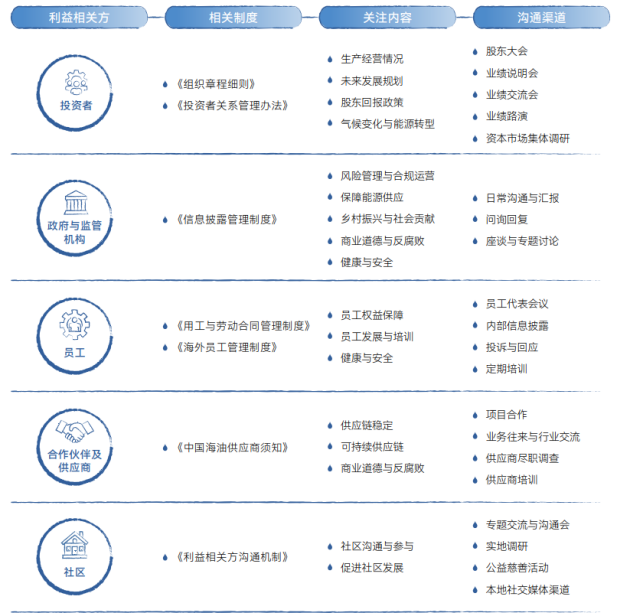 中國海油持續(xù)強化與利益相關(guān)方的雙向溝通機制,積極構(gòu)建開放透明、多元化且持續(xù)優(yōu)化的溝通體系。我們主動與各方就多項ESG相關(guān)議題展開深入對話,動態(tài)掌握利益相關(guān)方核心訴求與價值期待,全面審視并了解公司運營對利益相關(guān)方的影響,特別關(guān)注弱勢群體的需求與期望,并基于此不斷完善ESG管理體系。我們不斷深化與利益相關(guān)方的合作,制定并實施針對性的社區(qū)參與計劃和民生改善策略,通過負(fù)責(zé)任的投資和實際行動,促進社區(qū)的可持續(xù)發(fā)展,為提升民眾福祉、促進社會和諧與繁榮貢獻力量。